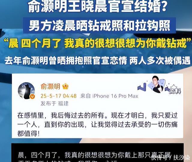 2025年5月中旬俞灏明突然凌晨发文:一张钻戒照,下面手写“晨,想为你戴钻戒”,还说“你的出现,让我从前的苦有了归处”。网友全炸了,纷纷去王晓晨评论区送祝福,可她没回应,5天后只发了条新剧定妆照,像没看见那些消息。